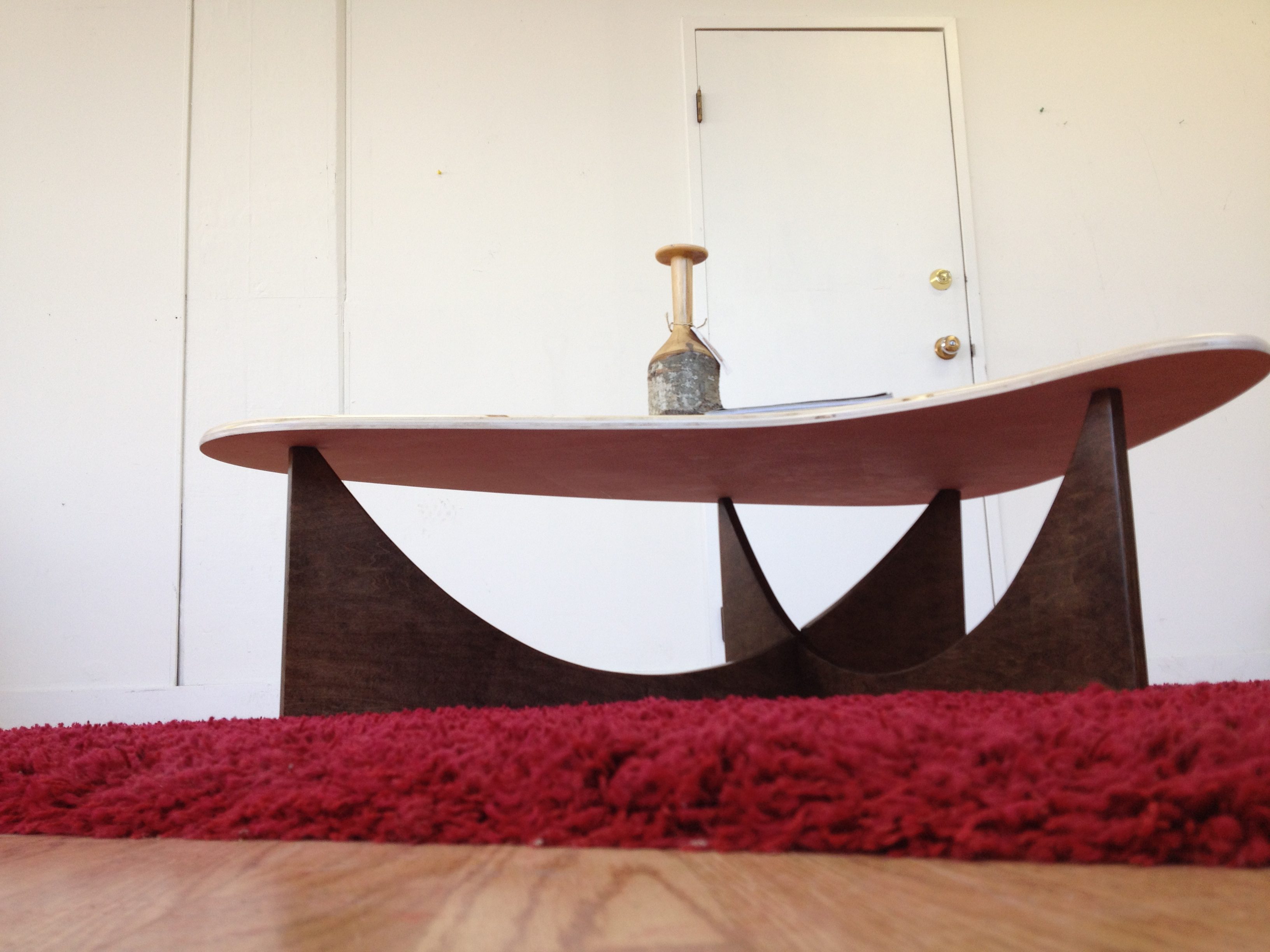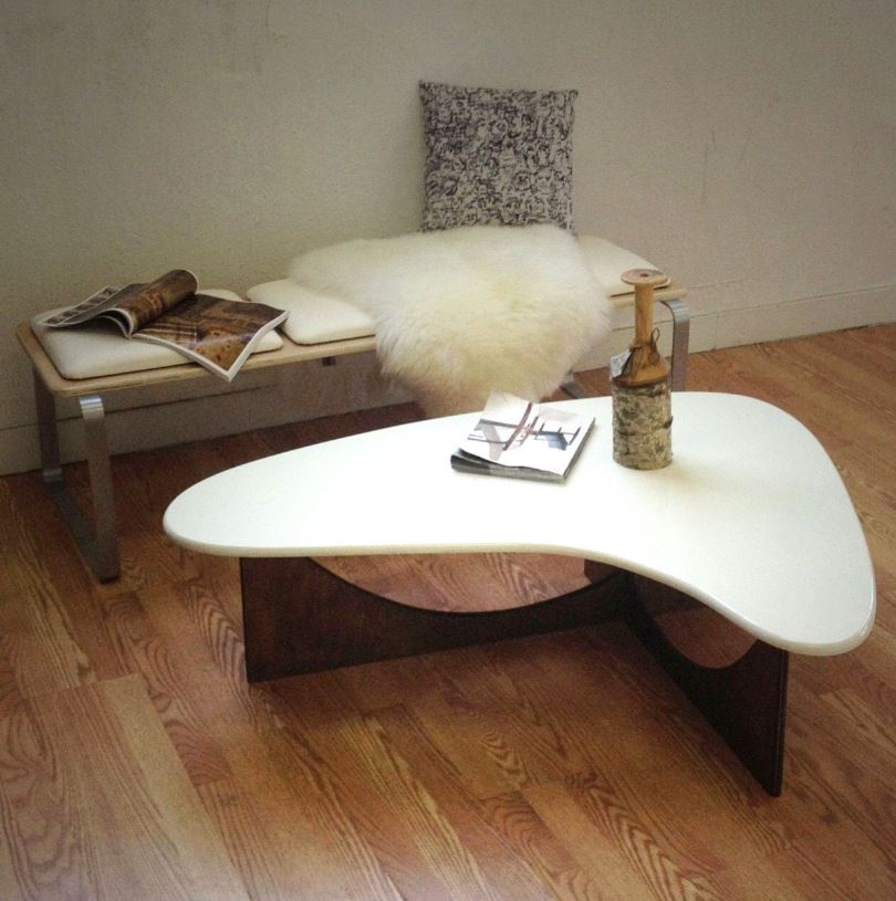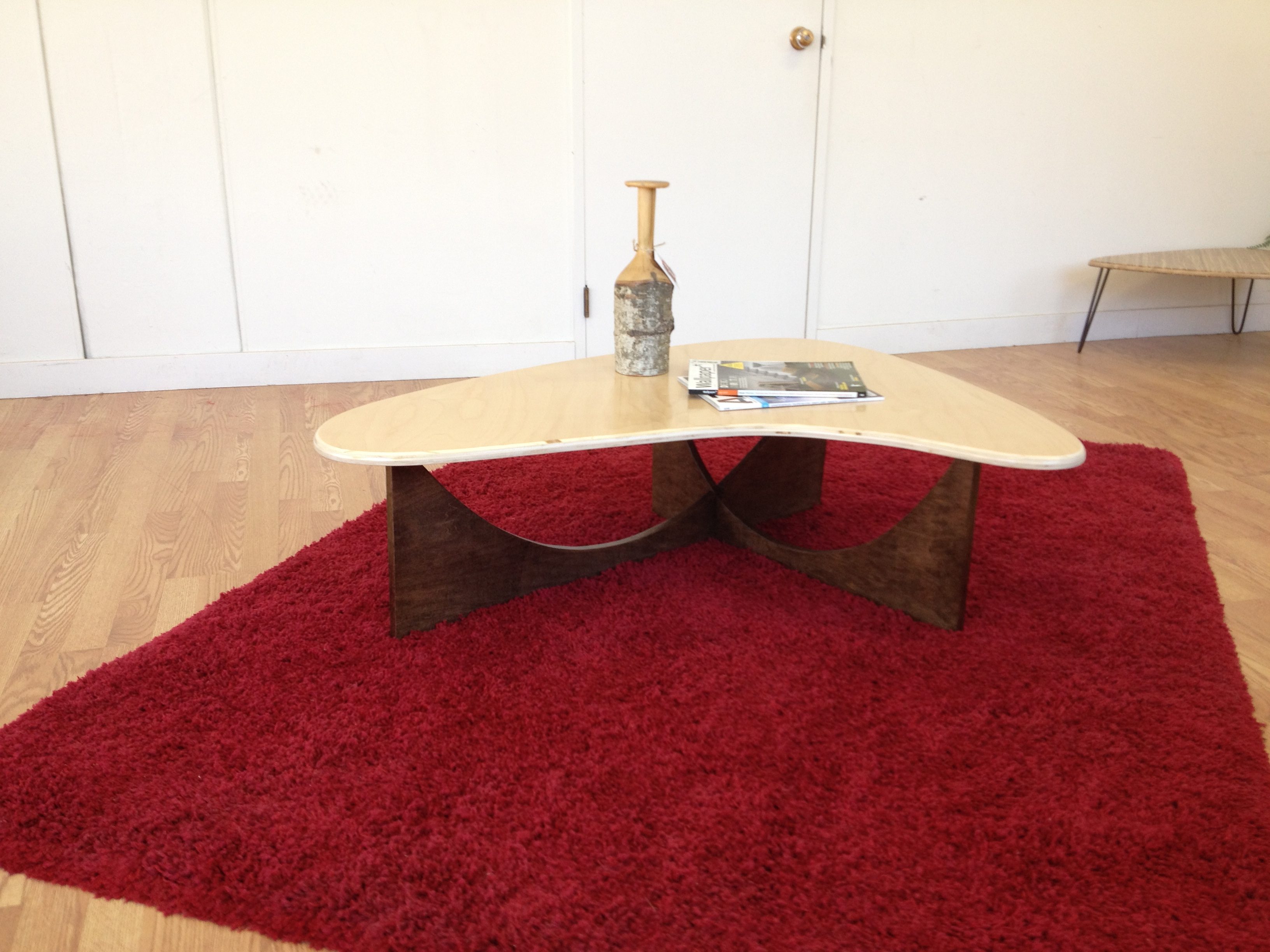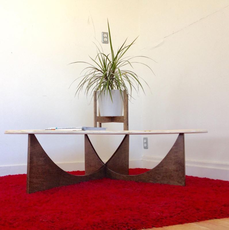 The sweeping curves of the table base are easily reminiscent of the those great roof supports found on the presidential palace/ Constructed from 3/4″ birch ply, using slot joint construction and a fasteners for a stylish sturdy table.