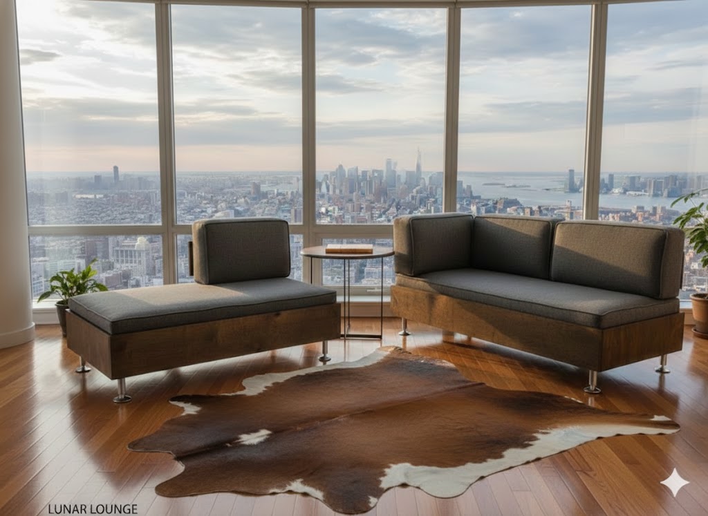 E.F. [Exposed Frame]. Unlike so many sectionals or typical living room furniture where the frame is hidden with foam and fabric I wanted to appreciate the framework..by having it exposed and visible like an exoskeleton and second to add detail by combining unique wood grains , stain options and brushed aluminum details that will compliment any space. Like many of my pieces they are minimal and very visual…unpretentious and yet bold.